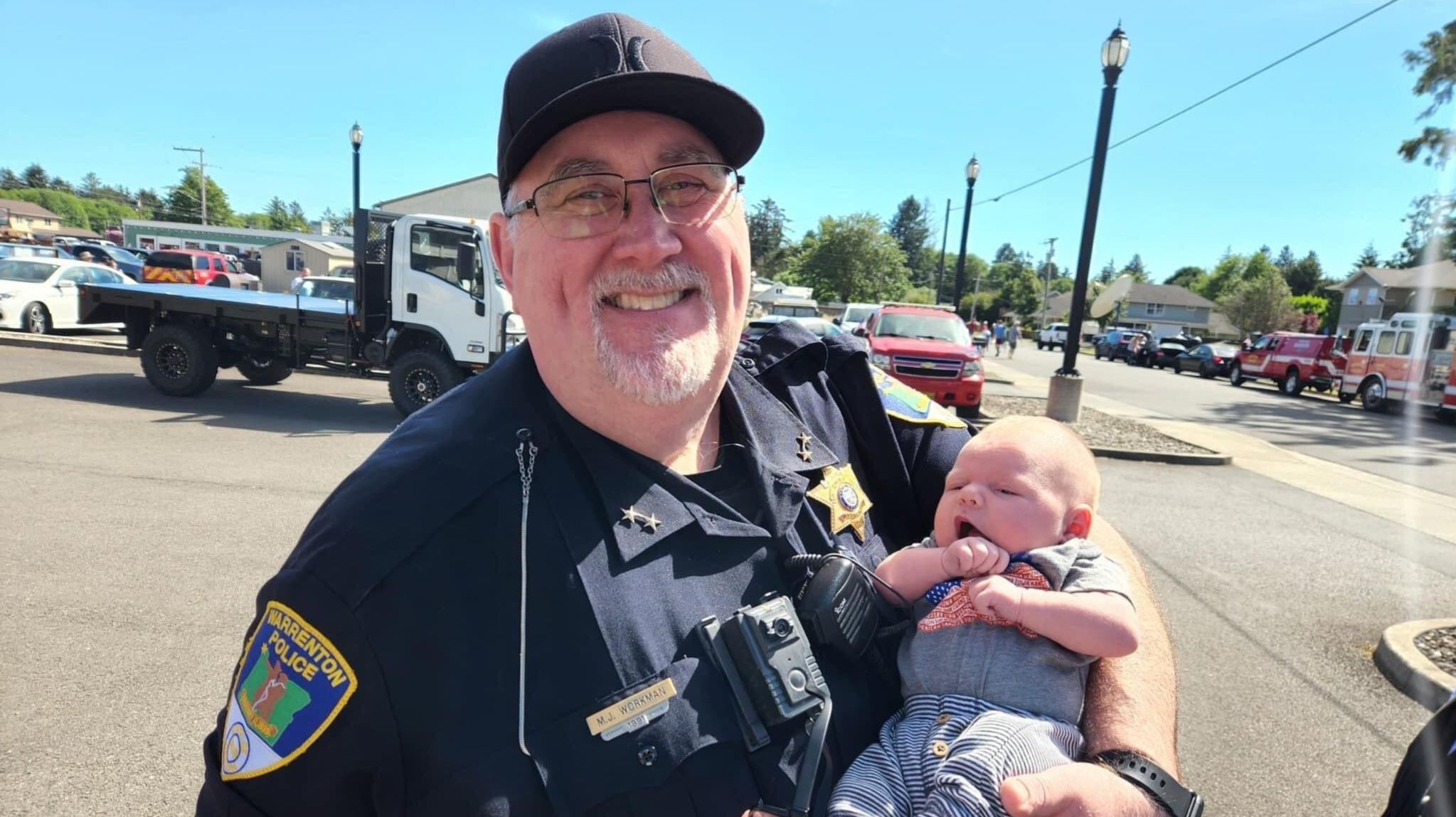 Chief Matt Workman (Warrenton PD) holds his beautiful grandson at the Warrenton parade.
